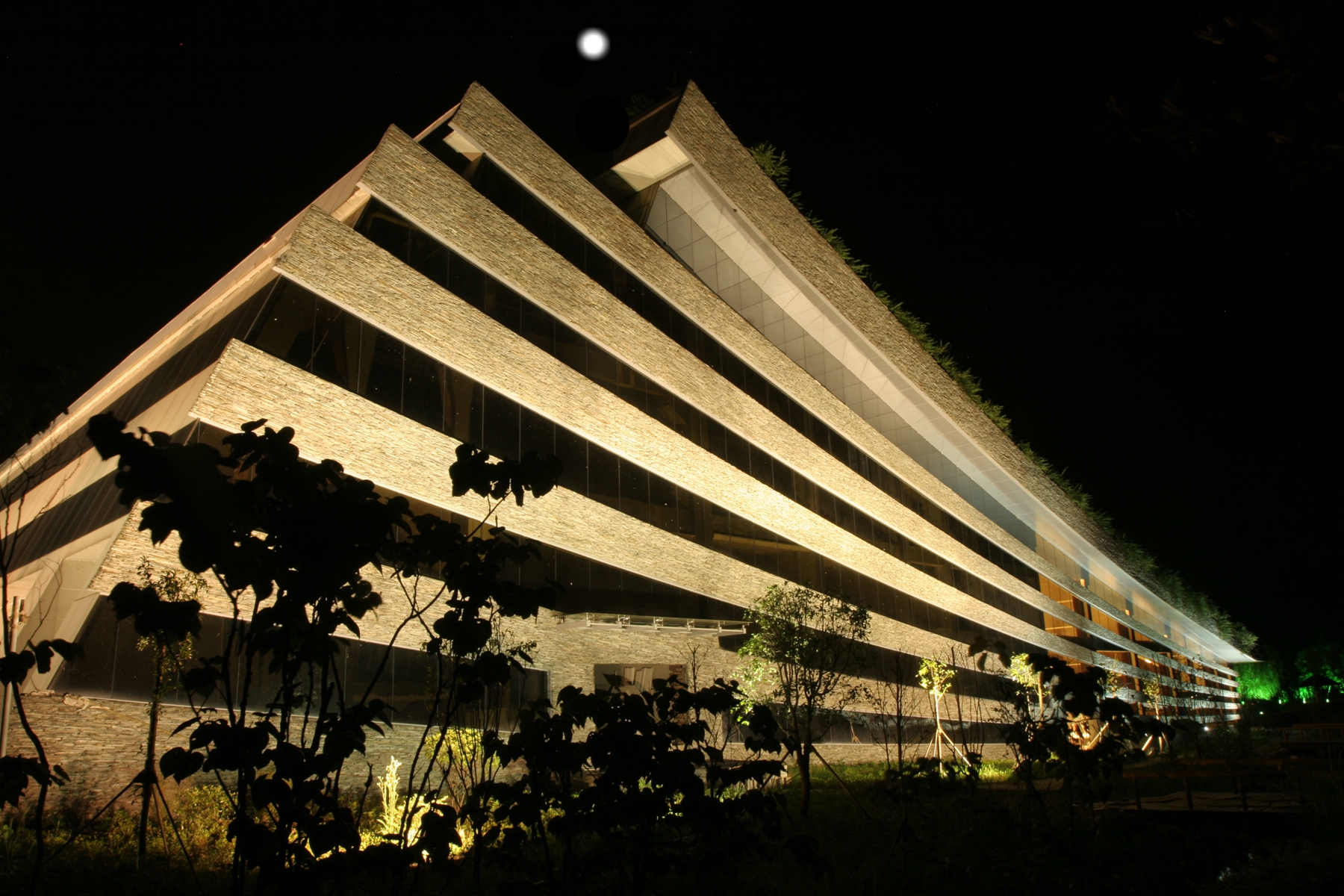 黃龍音樂廳是張家界文化地標性建筑,于2010年建成并投入使用。其單體斜坡面屋頂全部為綠茵花草覆蓋,是目前國際上屋頂綠化面積最大的建筑,也是世界公認的綠色環(huán)保音樂廳。