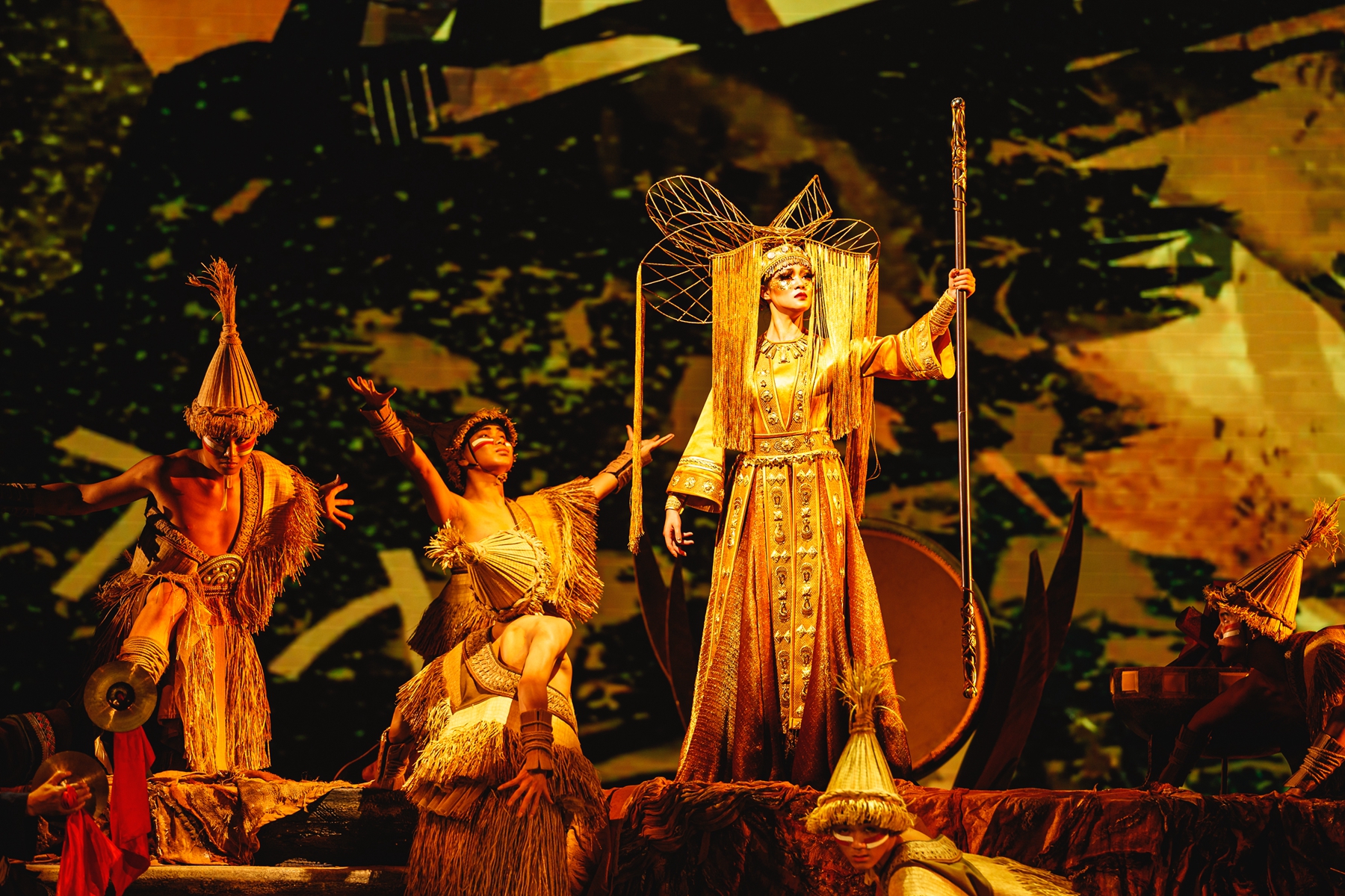 強勁的節(jié)奏在祠堂上空響起,赤裸上身、身著原始草裙的村民肅立成陣,跳起了土苗民族的茅古斯舞;舞臺中心的升降臺載著裝扮華麗神秘的女祭司慢慢升起,作為這場儀式的指揮,她的吟唱仿佛統(tǒng)領著整個森林山谷中的所有神力......